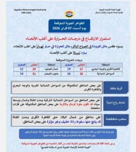 وأشارت الهيئة في بيان لها إلى أنه يسود طقس مائل للبرودة في الصباح الباكر، مائل للحرارة نهارًا على أغلب الأنحا.