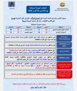 أكدت هيئة الأرصاد الجوية أنه يسود البلاد اليوم طقس بارد إلى شديد البرودة في الصباح الباكر، وليلًا، دافئ إلى مائل للحرارة نهاراً على أغلب الأنحاء.