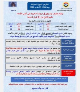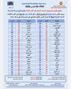 وأوضحت الهيئة أن الطقس سيكون شديد البرودة في الصباح الباكر، مائلًا للدفء إلى دافئ نهارًا على معظم المناطق، بينما يسود طقس شديد البرودة ليلًا، مع فرص لتكوّن الصقيع على المزروعات في وسط سيناء.