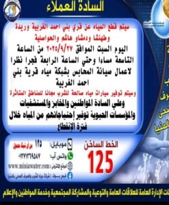 وأوضحت الشركة في بيانها أن الانقطاع يأتي نظرًا لإجراء أعمال صيانة عاجلة لخطوط وشبكات المياه الخاصة بمجمع بني أحمد الغربية، مؤكدة حرصها على تنفيذ أعمال الصيانة في أسرع وقت ممكن لإعادة ضخ المياه بصورة طبيعية.