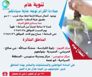 أعلنت شركة مياه الشرب والصرف الصحي بمحافظة الفيوم انقطاع مياه الشرب بعدد من المناطق، وذلك بسبب تنفيذ أعمال صيانة لازمة لخط مياه قطر 1000 مم بطريق عزبة السلام – عاشور.