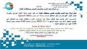 وأوضحت الشركة أن فصل التيار الكهربائي سيؤدي إلى توقف محطة مياه أبو صوير الكبرى، مما يترتب عليه انقطاع المياه عن المناطق التي تغذيها المحطة، وذلك خلال الفترة من الساعة 8:00 صباحًا وحتى الساعة 1:00 ظهرًا.