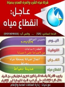 أعلنت شركة مياه الشرب والصرف الصحي بدمياط عن انقطاع مياه الشرب بمدينة دمياط، اليوم الخميس الموافق 29 / 1 / 2026، لمدة تقدر بنحو 8 ساعات، وذلك اعتبارًا من الساعة 9 صباحًا وحتى الساعة 5 مساءً.