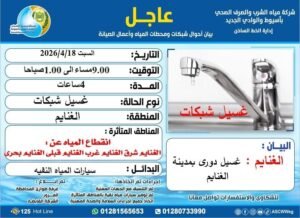 أعلنت شركة مياه الشرب والصرف الصحي بأسيوط والوادي الجديد عن تنفيذ أعمال غسيل دوري لشبكات المياه بمدينة الغنايم، وذلك في إطار خطة الصيانة الدورية لتحسين جودة الخدمة المقدمة للمواطنين.