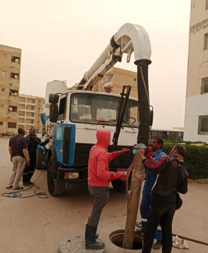 على مدار الساعة.. رجال مياه البحر الأحمر بواصلون تطهير الشبكات