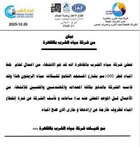 واعتذرت الشركة للمواطنين عن فترة انقطاع المياه لظروف خارجة عن إرادتها مشيرة إلى جار الآن ضخ المياه.