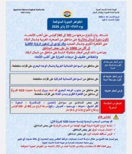 أكدت هيئة الأرصاد الجوية أن البلاد تشهد نشاطًا للرياح تتراوح سرعتها بين 30 إلى 40 كم/س على أغلب الأنحاء، تكون مثيرة للرمال والأتربة على مناطق من الصحراء الغربية وشمال البلاد، وقد تمتد حتى القاهرة الكبرى وشمال الصعيد، ما قد يؤدي إلى تدهور الرؤية الأفقية لأقل من 1000 متر على بعض المناطق.