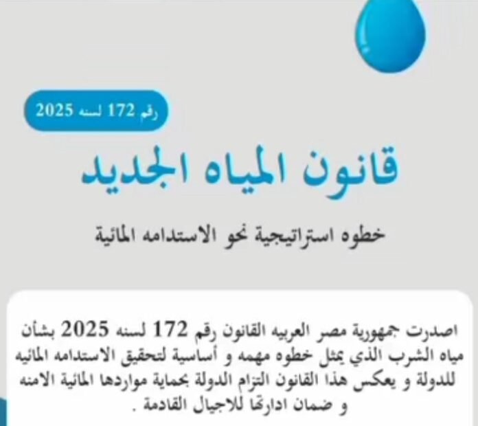 نشرت شركة مياه الشرب والصرف الصحي بالفيوم عبر صفحتها الرسمية تفاصيل القانون رقم 172 لسنة 2025 بشأن مياه الشرب، والذي أصدرته جمهورية مصر العربية في إطار توجه الدولة نحو تعزيز منظومة الأمن المائي والحفاظ على الموارد الطبيعية.