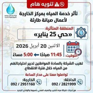 أعلنت شركة مياه الشرب والصرف الصحي بأسيوط والوادي الجديد عن تأثر خدمة المياه بمركز الخارجة بمحافظة الوادي الجديد، وذلك نتيجة تنفيذ أعمال صيانة طارئة على خط المياه الرئيسي بمنطقة حي 25 يناير، في إطار خطة الشركة لرفع كفاءة الشبكات وتحسين جودة الخدمة المقدمة للمواطنين.