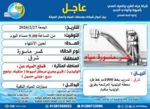 أعلنت شركة مياه الشرب والصرف الصحي بأسيوط والوادي الجديد عن حدوث كسر مفاجئ بخط طرد مرشح الوليدية قطر 1000 مم التابع لمنطقة شرق أسيوط ، مما يستلزم انقطاع مياه الشرب اعتبارًا من الساعة التاسعه مساء اليوم الجمعه الموافق 27 فبراير 2026م، حتي الانتهاء من الاعمال.