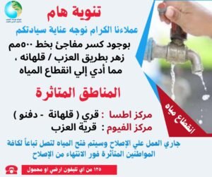 أعلنت شركة مياه الشرب والصرف الصحي بالفيوم حدوث كسر مفاجئ بخط مياه قطر 500 مم زهر بطريق العزب، قلهانة، مما أدى إلى انقطاع مياه الشرب بعدد من القرى التابعة لمركزي أطسا والفيوم.