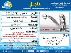 أعلنت شركة مياه الشرب والصرف الصحي بأسيوط والوادي الجديد عن حدوث كسر مفاجئ بخط طرد صرف صحي المراغي قطر 800 مم التابع لمنطقة غرب أسيوط، مما يستلزم انقطاع مياه الشرب اعتبارًا من الساعة الحادية عشرة مساء اليوم الخميس الموافق 12 فبراير 2026م، وحتى الانتهاء من الأعمال.