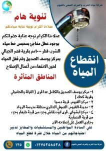 ودعت الشركة المواطنين والمستشفيات والمخابز إلى اتخاذ الاحتياطات اللازمة وتدبير احتياجاتهم من المياه خلال فترة الانقطاع، مؤكدة حرصها على سرعة الانتهاء من أعمال الإصلاح وإعادة الخدمة فور الانتهاء منها.