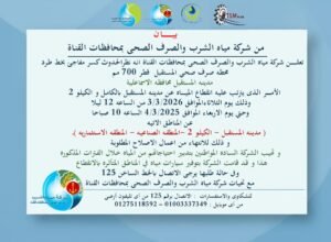 أعلنت شركة مياه الشرب والصرف الصحي بمحافظات القناة عن حدوث كسر مفاجئ بخط طرد محطة صرف صحي المستقبل قطر 700 مم بمدينة المستقبل بمحافظة الإسماعيلية، ما يستلزم تنفيذ أعمال إصلاح عاجلة.