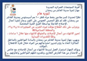 ويهيب جهاز تنمية مدينة العاشر من رمضان بالسادة المواطنين بالمناطق المتأثرة تدبير احتياجاتهم من المياه خلال فترة الانقطاع المؤقت.