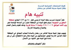 بسبب حدوث تسريب في خط المياه الرئيسي قطر 1400 مم GRP المغذي للمنطقة الجنوبية للمطورين بمدينة العاشر من رمضان، أعلن جهاز تنمية مدينة العاشر من رمضان عن انقطاع مياه الشرب غدًا الأحد الموافق 19 أكتوبر 2025، بدءًا من الساعة الواحدة فجرًا ولمدة 12 ساعة تقريبًا، وذلك لتنفيذ أعمال اللحام والإصلاح اللازمة.