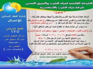 أعلنت شركة مياه الشرب والصرف الصحي بالإسكندرية، أنه في إطار تنفيذ المشروع القومي لإنشاء القطار السريع بمنطقة برج العرب الساحلي، سيتم ترحيل عدد 2 خط ناقل للمياه قطر 1000 مم والمغذي لمدينة الحمام.