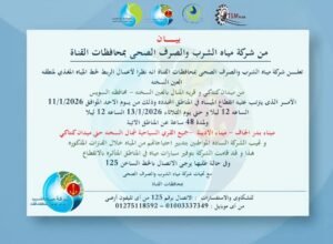 وتهيب الشركة بالسادة المواطنين، وأصحاب المنشآت الخدمية، بتدبير احتياجاتهم من المياه خلال فترة الانقطاع، مؤكدة توفير سيارات مياه صالحة للشرب بالمناطق المتأثرة.