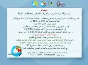 وأوضحت الشركة أن الانقطاع يبدأ من الساعة العاشرة مساء اليوم الأحد وحتى السادسة صباح الاثنين 16 فبراير 2026، ويشمل منطقتي نفيشة القبلية ونفيشة البحرية، لحين الانتهاء من أعمال الإصلاح المطلوبة وإعادة ضخ المياه بصورة طبيعية.