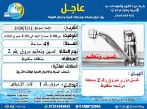 وأوضحت الشركة أن ضعف المياه يبدأ من الساعة 8 صباح يوم الأحد الموافق 11 يناير 2026، وحتى الساعة 8 صباح يوم الثلاثاء الموافق 13 يناير 2026، مما قد يؤدي إلى ضعف ضغط المياه بالأدوار العليا خلال فترات الذروة طوال فترة الصيانة ولمدة يومين فقط، وذلك بهدف تحقيق جودة المياه المنتجة.