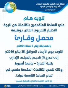 أعلنت شركة مياه الشرب والصرف الصحي بأسيوط والوادي الجديد موعد فحص تظلمات المتقدمين من نتيجة الاختبار التحريري الخاص بالمسابقة رقم ( 3 ) لسنة 2024م لوظيفة (قارئ / محصل)، والذين تقدموا بتظلماتهم خلال الفترة من 11 حتى 15 يناير 2026م، والتي سبق الإعلان عنها على الصفحة الرسمية للشركة وموقعها الإلكتروني.