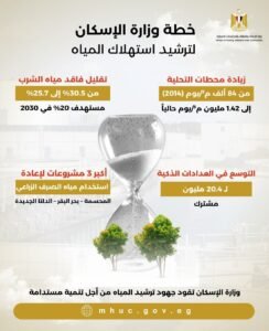 وأشار وزير الإسكان إلى أن الدولة المصرية عملت خلال السنوات الماضية على تنفيذ خطة شاملة لترشيد استهلاك المياه وضمان الأمن المائي للأجيال القادمة، وأولت وزارة الإسكان بشكل خاص هذا الملف أهمية قصوى باعتباره أحد ركائز تحقيق التنمية المستدامة، حيث قامت بتنفيذ استراتيجية وطنية تستند إلى محاور متعددة .