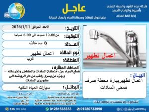 أعلنت شركة مياه الشرب والصرف الصحي بأسيوط والوادي الجديد عن تنفيذ أعمال تطهير بيارة محطة صرف صحي السادات التابعة لمنطقة غرب أسيوط، وذلك اعتبارًا من الساعة 12 مساء ليل السبت وحتى الساعة 6 صباح يوم الأحد الموافق 11 يناير 2026م، ولمدة 6 ساعات، مما يستلزم انقطاعًا جزئيًا للمياه خلال فترة الأعمال.