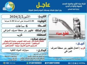 أعلنت شركة مياه الشرب والصرف الصحي بأسيوط والوادي الجديد عن تنفيذ أعمال تطهير بيارة محطة صرف صحي المراغي التابعة لمطقة غرب أسيوط ، وذلك اعتبارًا من الساعة 12 صباح يوم الاثنين الموافق 2 فبراير 2026 وحتى الساعة 6 فجرا من نفس اليوم ولمدة 6 ساعات، مما يستلزم انقطاعًا جزئيًا للمياه خلال فترة الأعمال لضمان سلامة التشغيل واستمرارية الخدمة.