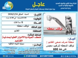 وأكدت الشركة أنه سيترتب على تنفيذ الأعمال انقطاع المياه عن مركز الغنايم خلال فترة التنفيذ، كما من المتوقع حدوث ضعف خفيف في ضغط المياه بالأدوار العليا، ولضمان تلبية احتياجات المواطنين، سيتم الدفع بسيارات مياه نقية طوال مدة الأعمال وحتى الانتهاء منها وعودة الخدمة إلى انتظامها الطبيعي.