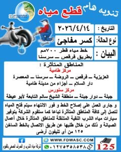 أعلنت شركة مياه الشرب والصرف الصحي بالفيوم عن قطع المياه، اليوم الاثنين 14 أبريل 2026، بسبب كسر مفاجئ بخط مياه رئيسي قطر 700 مم بطريق قرقص – سرسنا، ما أدى إلى تأثر عدد من المناطق بمركزي طامية وسنورس.