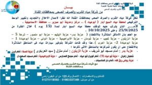 وكانت كانت قد أعلنت شركة مياه الشرب والصرف الصحي بمحافظات القناة عن تنفيذ أعمال الإحلال والتجديد وتغيير الوسط الترشيحي لمحطة مياه السبع آبار (أبو عياد) بمركز ومدينة أبو صوير – محافظة الإسماعيلية. ويترتب على ذلك توقف محطة مياه السبع آبار لمدة 15 يومًا خلال الفترة من 25/9/2025 وحتى 10/10/2025.