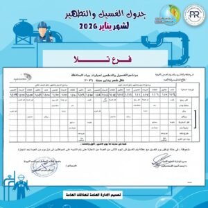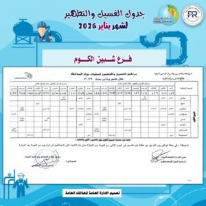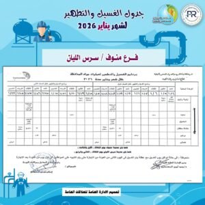 أعلن المهندس رشدي السيد عمر ، رئيس شركة مياه الشرب والصرف الصحى بالمنوفية، خطة غسيل شبكات المياه بكافة مناطق المحافظة خلال شهر يناير 2026م وفقًا للمناطق المحددة بجدول الغسيل الدورى للشبكات.