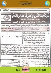 أعلنت شركة مياه الشرب والصرف الصحي بالمنيا، إحدى الشركات التابعة للشركة القابضة لمياه الشرب والصرف الصحي، عن طرح مزايدة علنية عامة بنظام المظاريف المغلقة (فني ومالي) لبيع الحمأة الناتجة من محطات معالجة الصرف الصحي بمراكز: مطاي، المنيا، أبو قرقاص، ودير مواس.