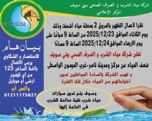 تعلن شركة مياه الشرب و الصرف الصحي ببني سويف، ضعف المياه عن مركز ومدينة ناصر -غرب الميمون بمركز الواسطى وذلك نظرًا لأعمال تطهير بالمروق 2 بمحطة مياه أشمنت وذلك يوم الثلاثاء الموافق 2025/12/23 الساعة 9 صباحاً حتى الساعة 9 مساءً يوم الأربعاء الموافق 2025/12/24 .