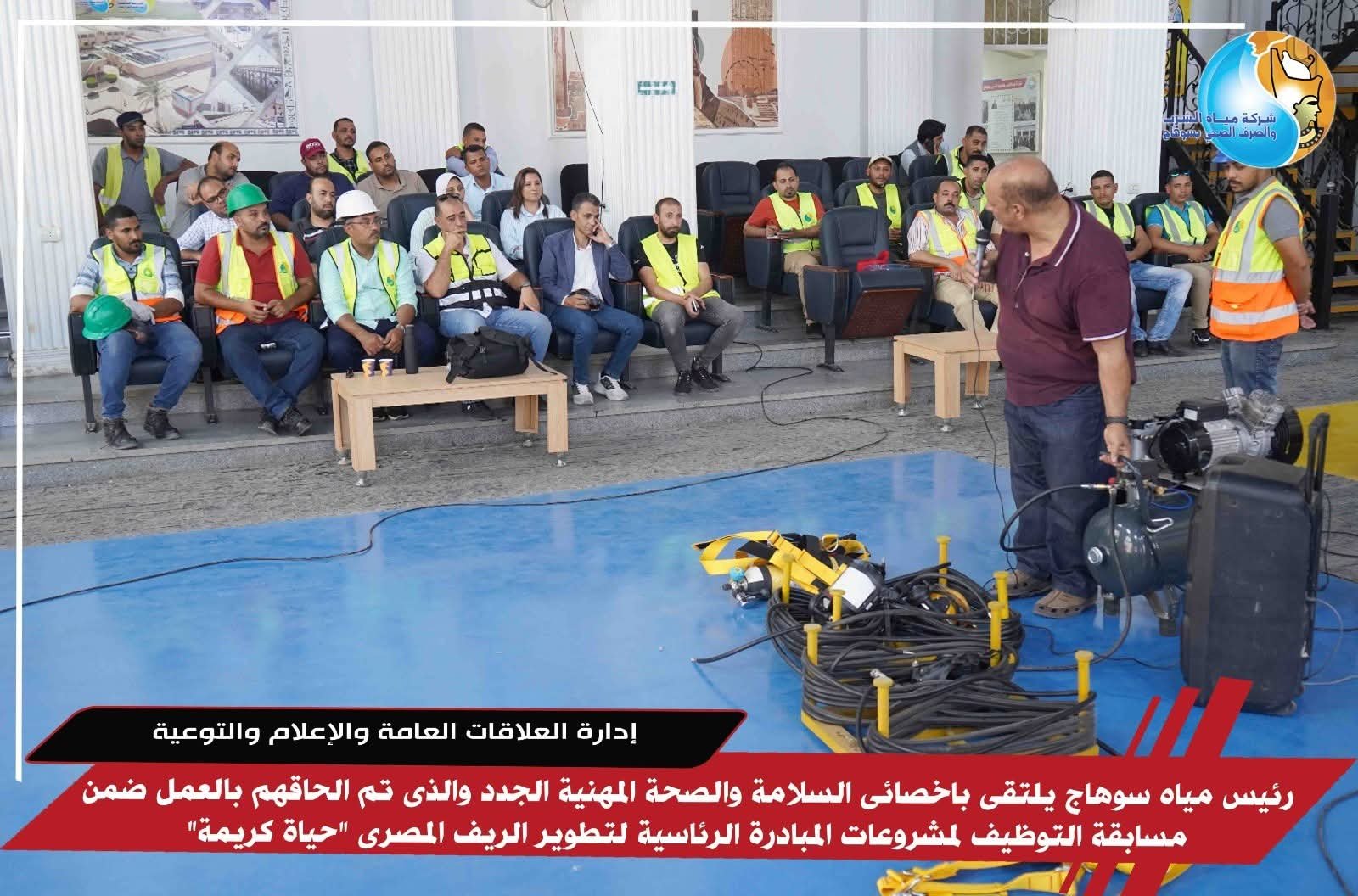 التقى المهندس محمد صلاح الدين عبد الغفار رئيس مجلس إدارة شركة مياه الشرب والصرف الصحى بسوهاج والعضو المنتدب باخصائى السلامة والصحة المهنية الجدد الذين تم إلحاقهم بالعمل من خلال المسابقة التى تم الاعلان عنها فى وقت سابق تزامنا مع بدء تنفيذ وتشغيل مشروعات المبادرة الرئاسية لتطوير الريف المصرى حياة كريمة وذلك على هامش البرنامج التدريبى الذى تم إعداده لتأهيلهم للعمل بقطاع مياه الشرب والصرف الصحى.