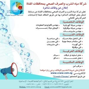 أعلنت شركة مياه الشرب والصرف الصحي بمحافظات القناة عن مسايقة لشغل بعض الوظائف الشاغرة بها، وذلك عن طريق التعاقد حسب احتياجات الشركة..