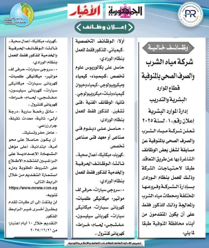 وظائف شاغرة.. “مياه المنوفية” تعلن عن مسابقة للعمل بفروعها المختلفة
