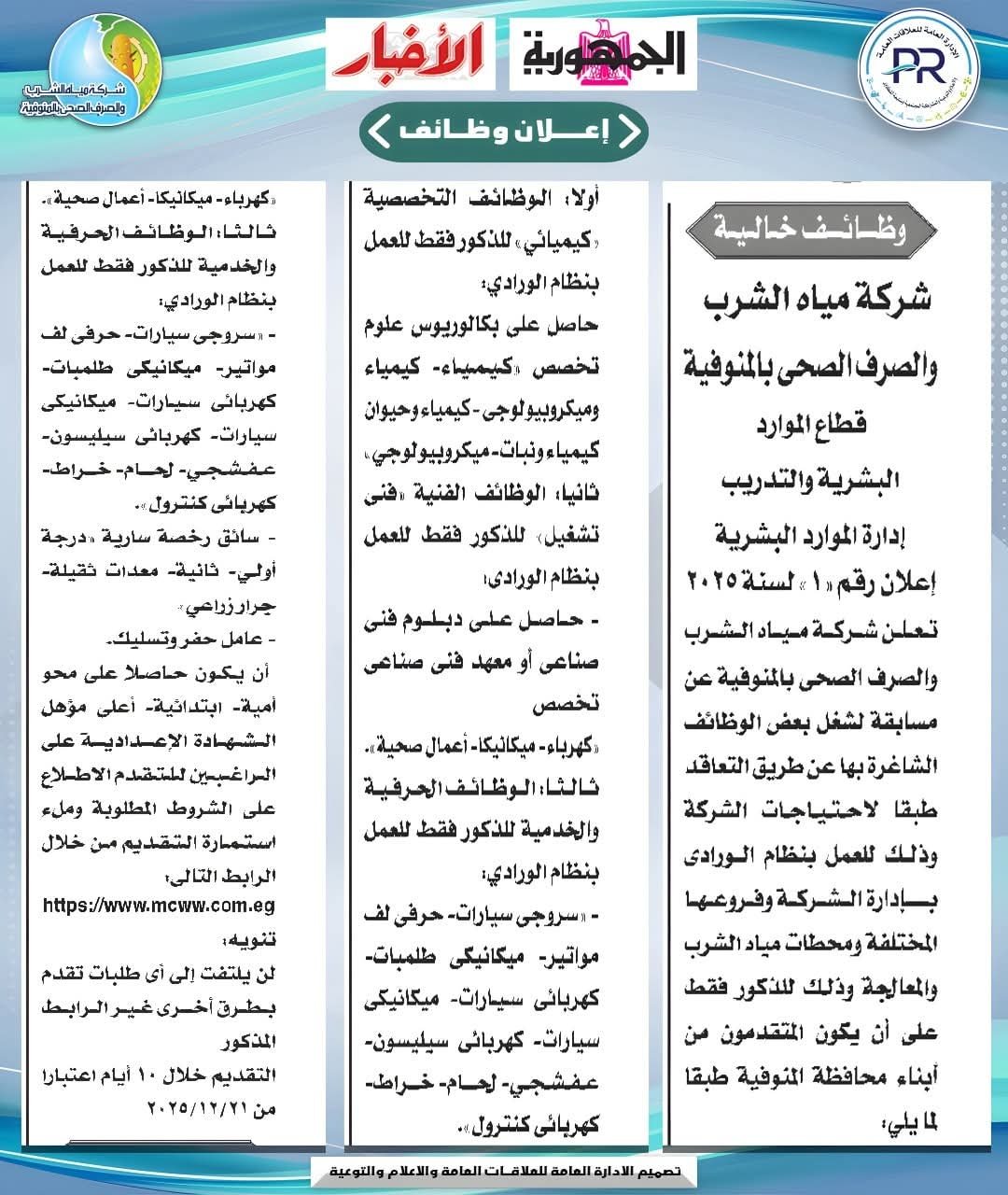 أعلنت شركة مياه الشرب والصرف الصحى بالمنوفية، عن مسابقة لشغل بعض الوظائف الشاغرة بها عن طريق التعاقد طبقًا لاحتياجات الشركة وذلك للعمل بنظام الورادى بإدارة الشركة وفروعها المختلفة ومحطات مياه الشرب والمعالجة وذلك للذكور فقط علي أن يكون المتقدمون من أبناء محافظة المنوفية.